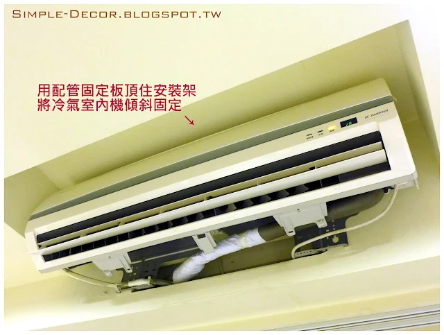 當初裝冷氣時,為了美觀做了木作包管,還覺得很值得。可是遇到要維修檢測時,還真是不方便!因為木作擋住了追查管線的路徑,所以我只好把冷氣喬成斜的,靠著所謂「配管固定板」,頂住安裝架,才能讓出手電筒和相機可穿過的空間。